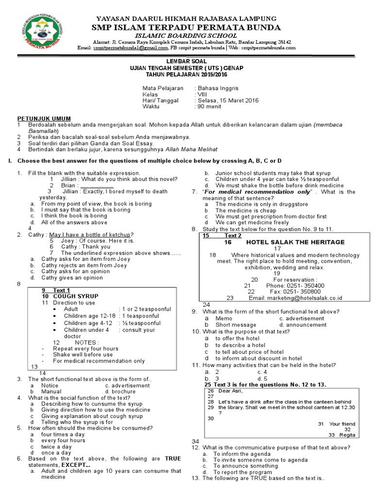 Soal Bahasa Inggris Viii Uts Genap 2015 2016 Louis Pasteur Medicine