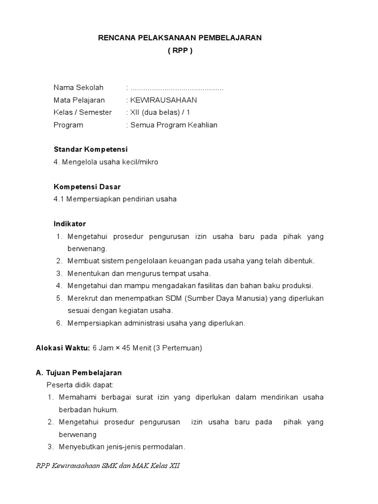 Download Contoh RPP Kewirausahaan SMK Kelas XII Genap KLIK DI SINI SENI BUDAYA SMK Akomodasi Perhotelan SILABUS dan RPP 1. Smk negeri 1 mata pelajaran. Kewirausahaan SMK KELAS XII downloaddi sini.