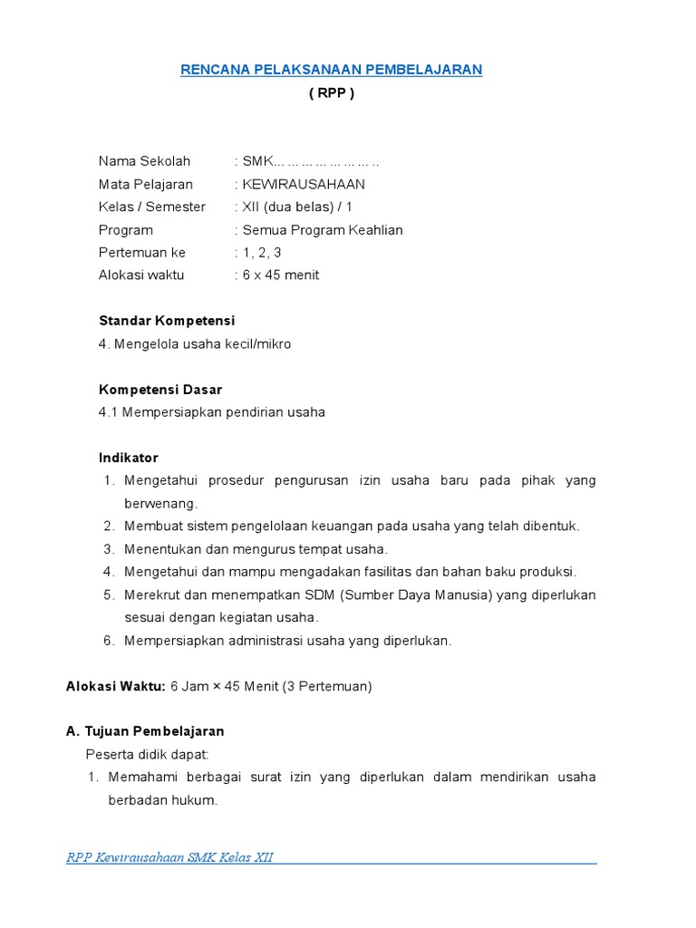 RPP KEWIRAUSAHAAN SMK PLUS ARRAHMAH KELAS XI RENCANA PELAKSANAAN PEMBELAJARAN RPP Sekolah. Kenapa kok sama RPP kewirausahaan kelas 2 dg klls 3 bu. Xi 1 dan 2 standar kompetensi.