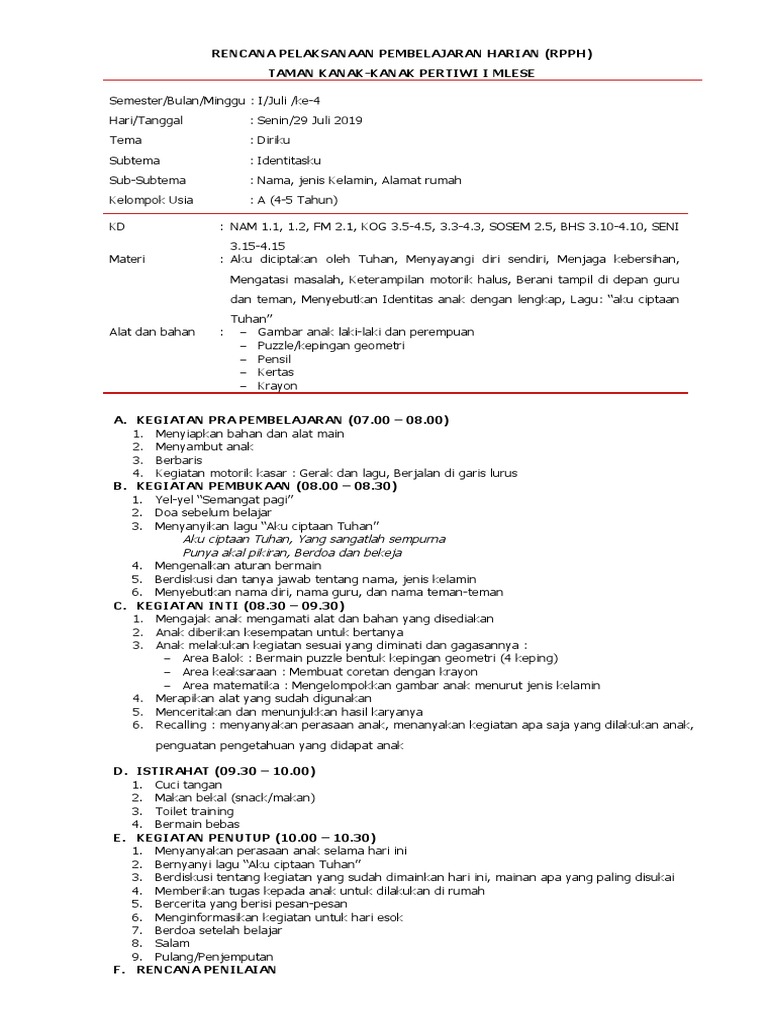 Contoh rpph paud tema diriku identitasku kebutuhanku kelompok a silakan ayah bunda unduh contoh rpph paud kurikulum 2013 untuk kelompok a tema diriku identitasku kebutuhanku dan lain lainnya. Contoh rkh rpph paud tema diri sendiri tubuhku kurikulum 2013. Nama baru untuk RKH Rentjana Kegiatan Harian adalah RPPH Rencana Pelaksanaan Pembelajaran Harian.